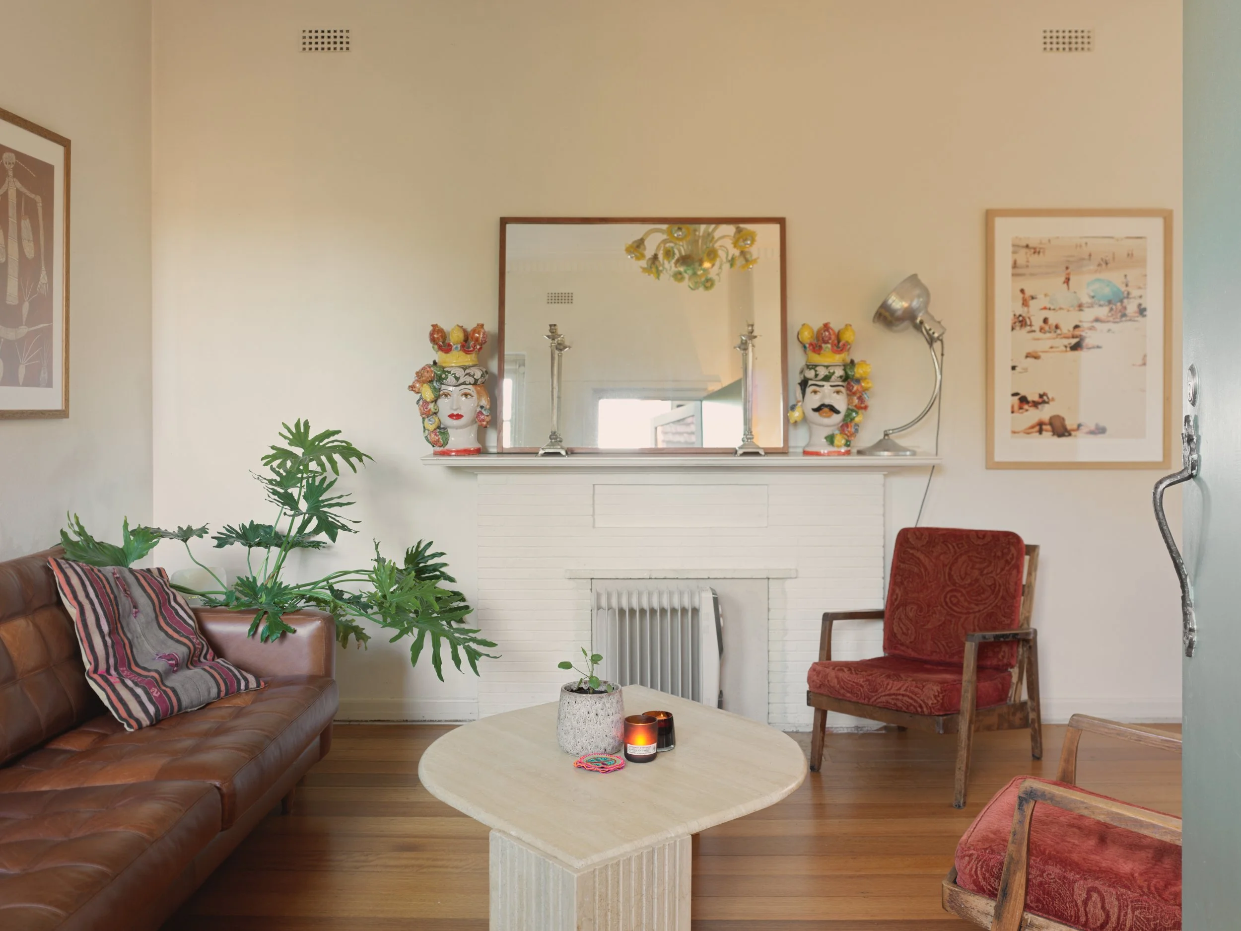 Nothing screams Melbourne more than exposed brick walls in Fitzroy, and this stunning cottage delivers that authentic experience in spades. The light-filled living room with wooden ceilings and stained glass windows serves as the centerpiece.